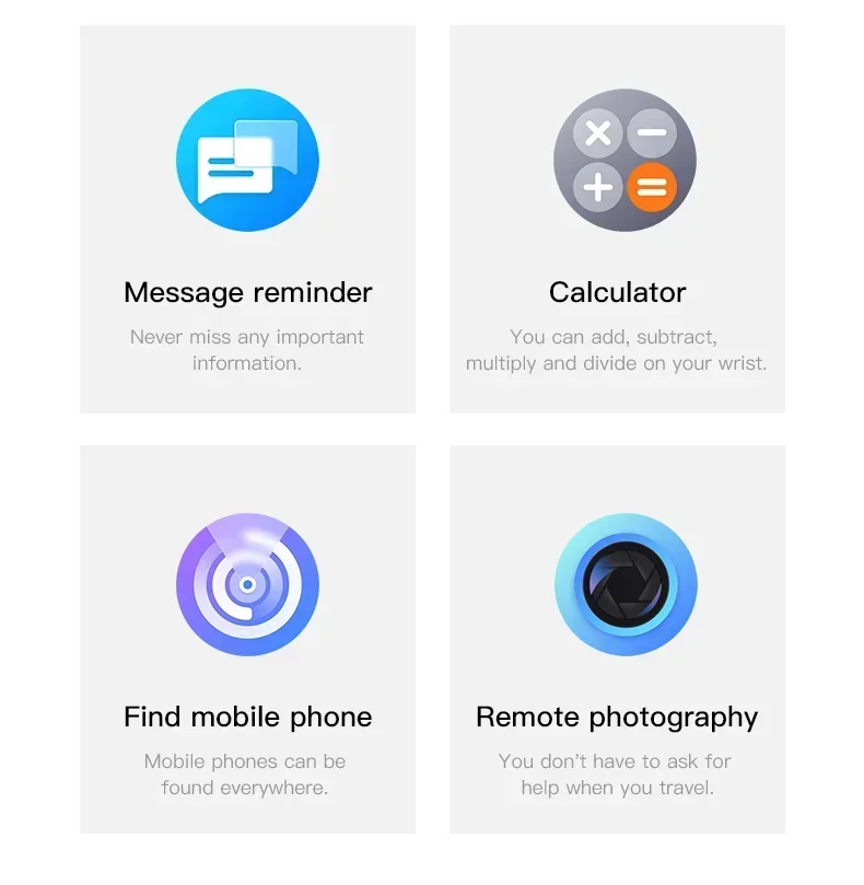 5. outras funções: gire o pulso para iluminar a tela, modo de baixo consumo de energia, modo silencioso, anti-perda, controle de foto, controle de música, cronômetro, despertador, calendário, calculadora.